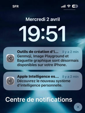 Je viens de tester et Apple Intelligence fonctionne > je n'ai plus le cercle d'animation de Siri au bas de l'écran > c'est le pourtour de l'écran de l'iPhone qui s'anime.
