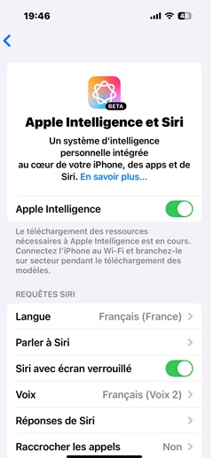 Bonjour Doctossimo, je viens de faire la mise à jour iOS 18.4 sur mon iPhone 15 Pro, après la mise à jour je suis allez à Réglages > Apple Intelligence voici ce qui s'affichait: