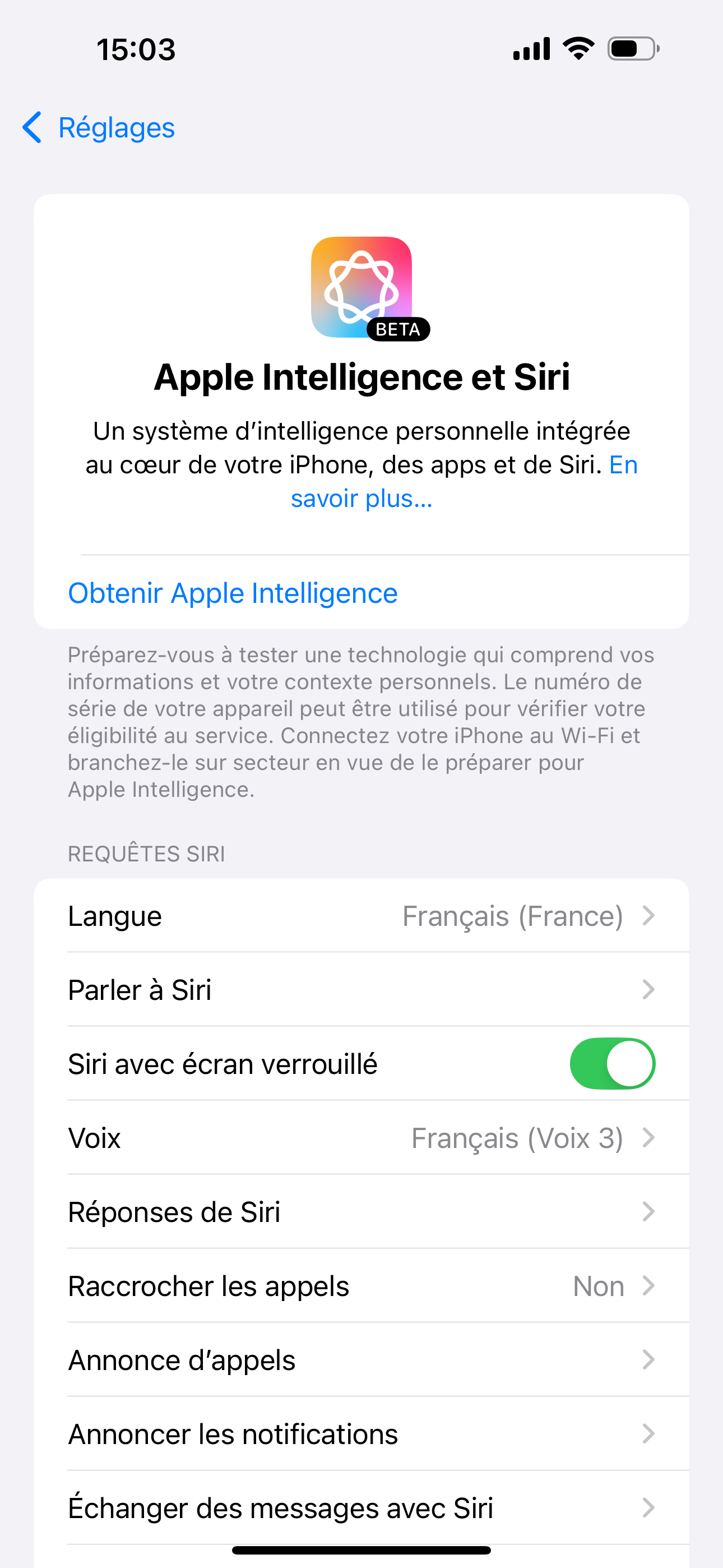 seuls les paramètres de Siri sont présents. Pourtant la langue de l’iPhone est le français et celle de Siri français (France).