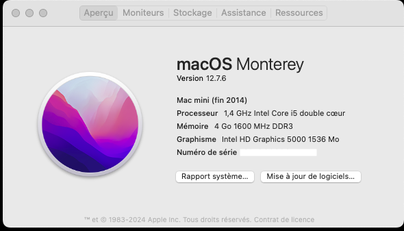 Voila j'ai pour la 1ere fois un Mac mini (fin 2014 ) OS Monterey version 12.7.6