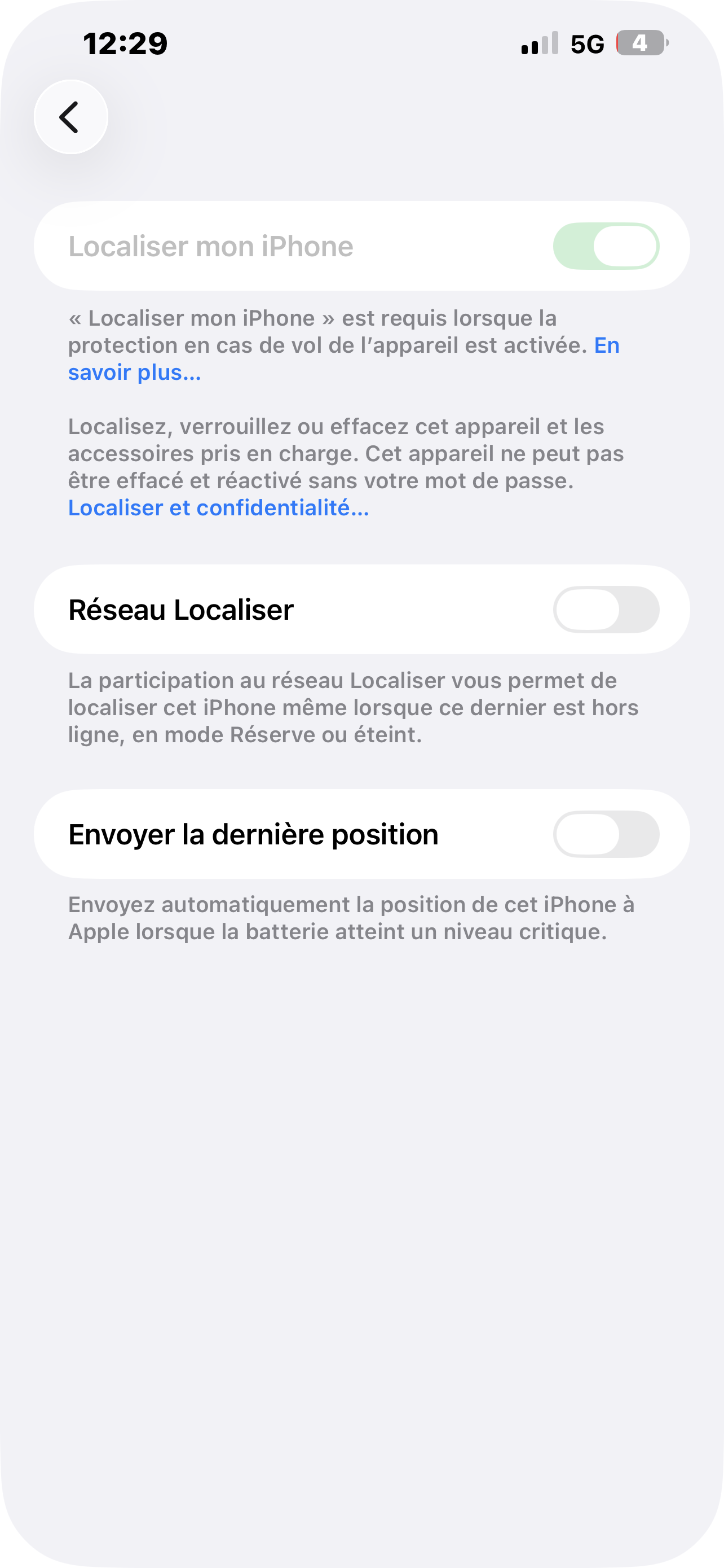 Bah je ne peux pas désactiver la case Localiser mon iPhone comme sur la photo