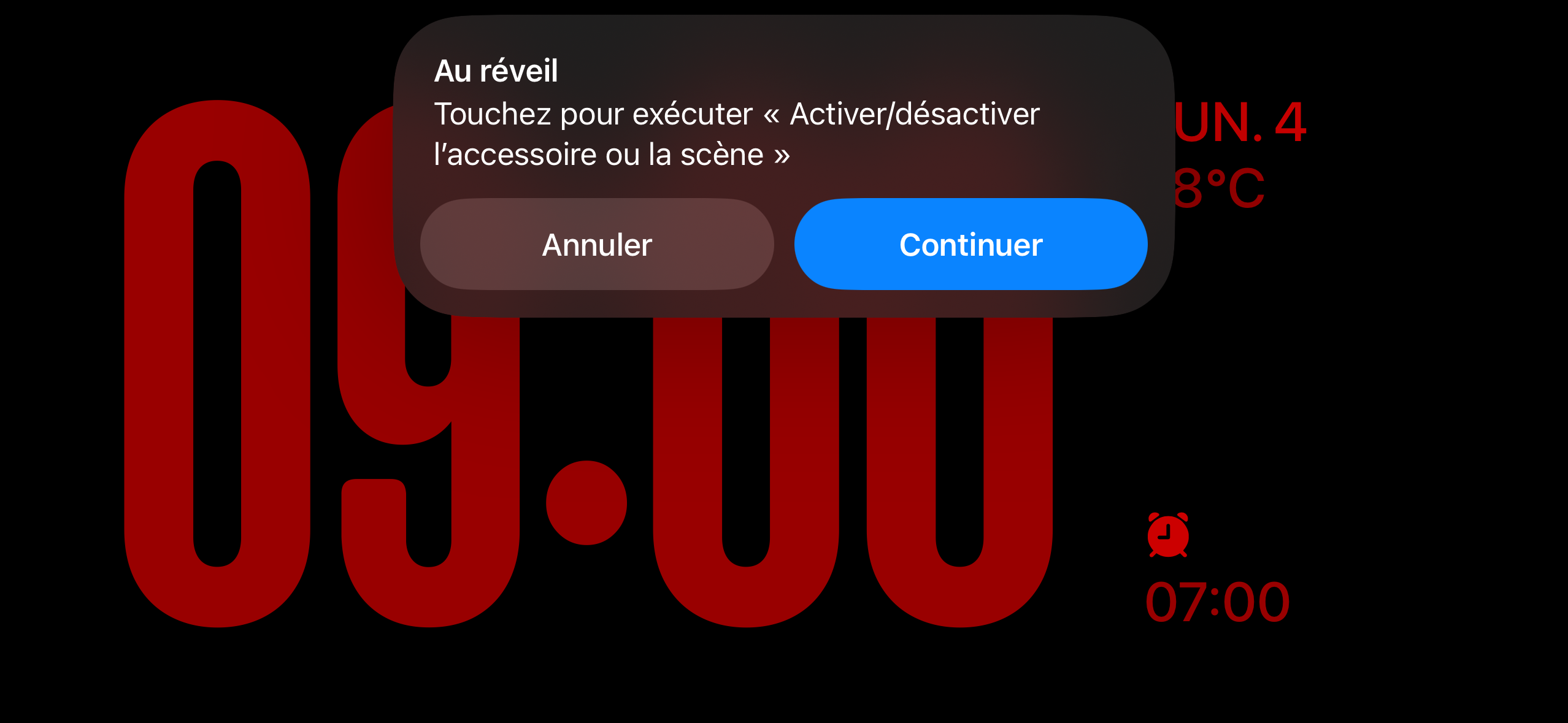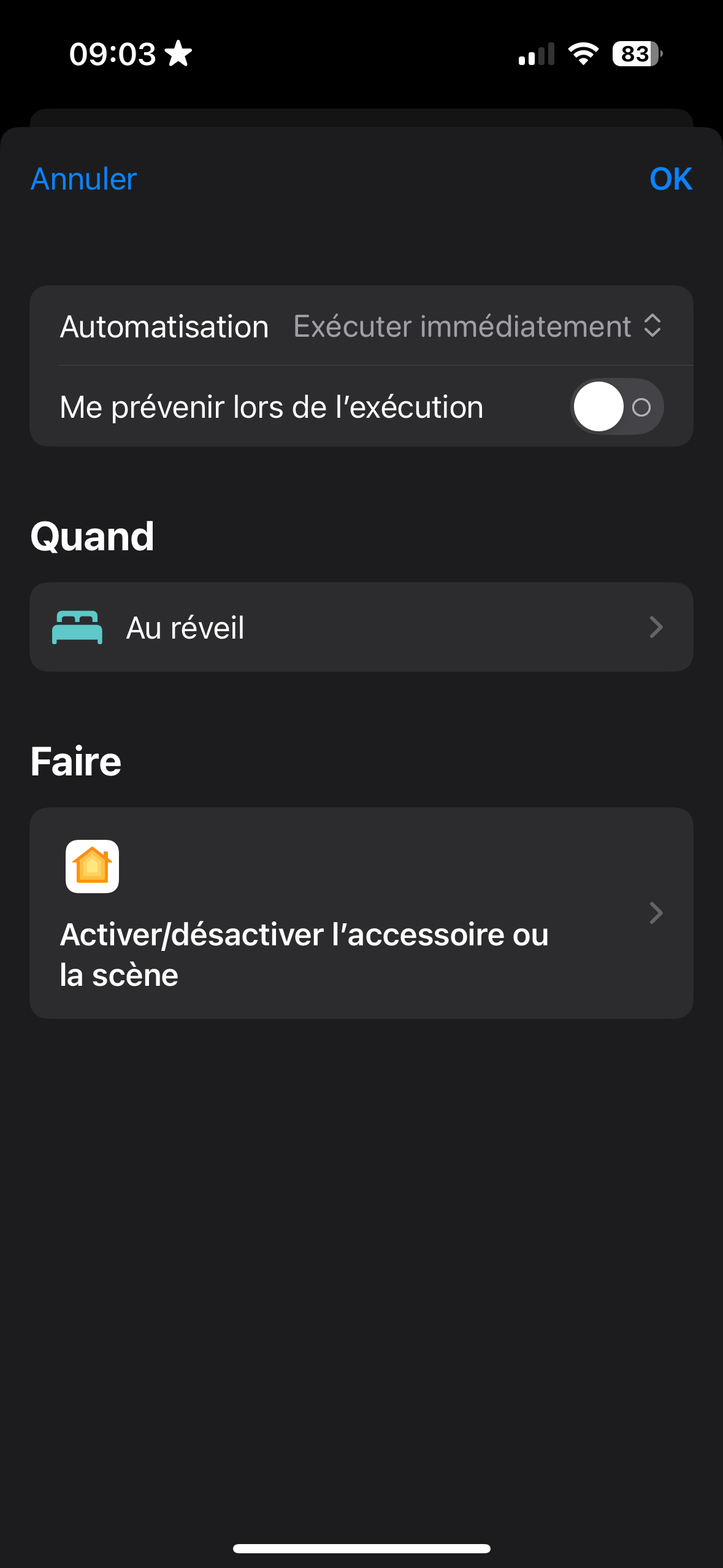 J'ai essayé avec raccourcis pour le diffuseur et la lumière, (exécuter immédiatement et la case décocher pour "Me prévenir lors de l'exécution"), mais il faut appuyer sur le bouton confirmer au réveil pour que sa fonctionne.