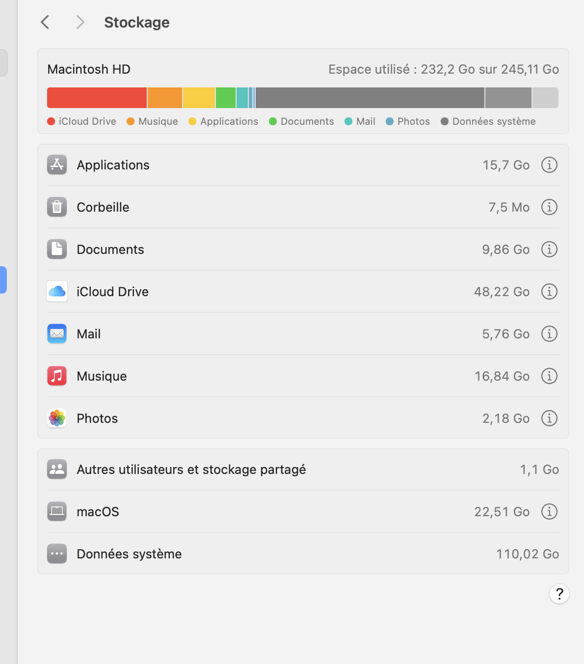 Mes données sytème de mon Mac bookair occupe 110 Go sur mes 256 G0. De plus, mon Icloud drive occupe 48 Go sur mon Mac. On me confirme que ce n'est pas normal. Il me reste seulement 11 G0sur ma capacité de 256 Go.