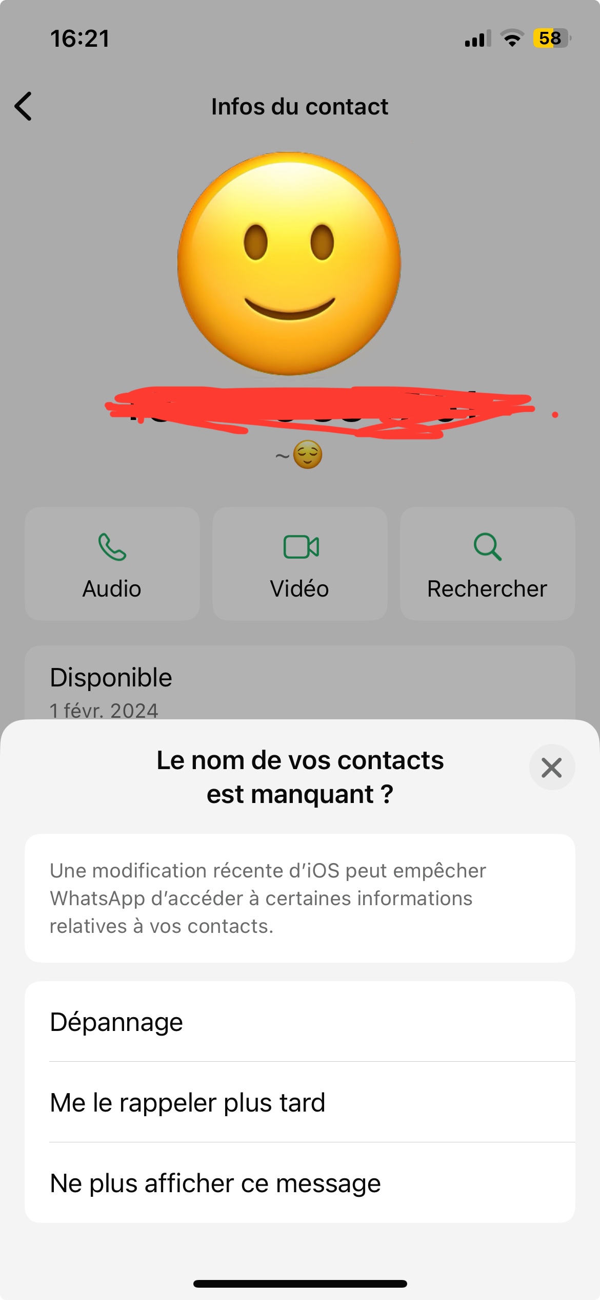 Enfin, pour illustrer mon problème, je joins une capture d’écran d’un message d’erreur envoyé par mon iPhone (qui détecte donc bien le problème) lorsque je vais sur le numéro d’un contact sur whatsap que j’avais auparavant enregistré. Il signale une « modification récente d’iOS »!! C’est là le cœur du problème.