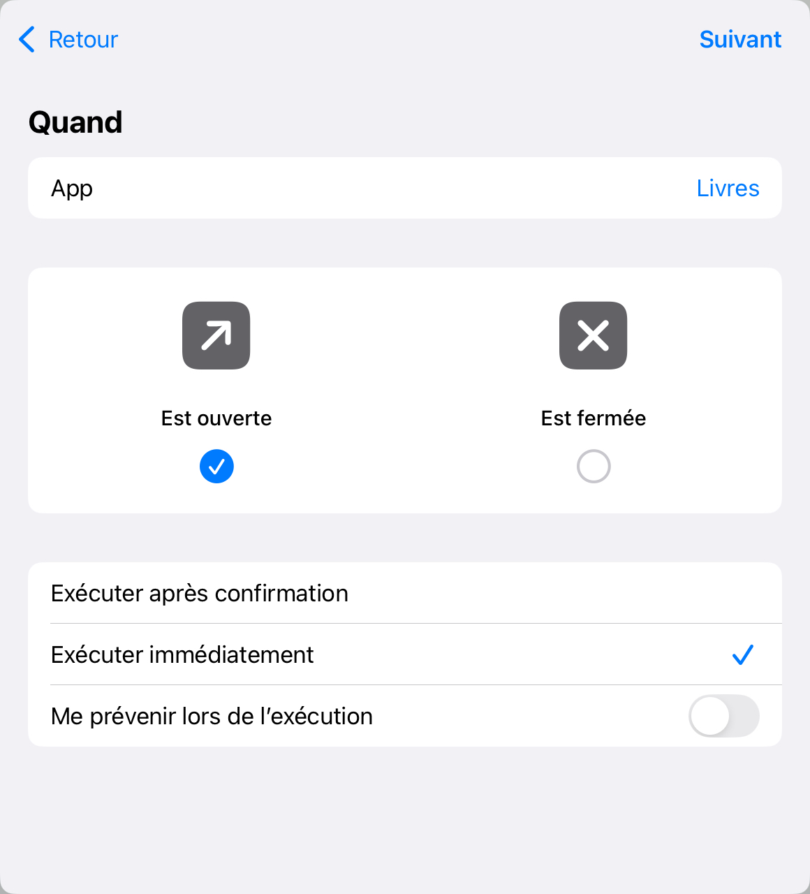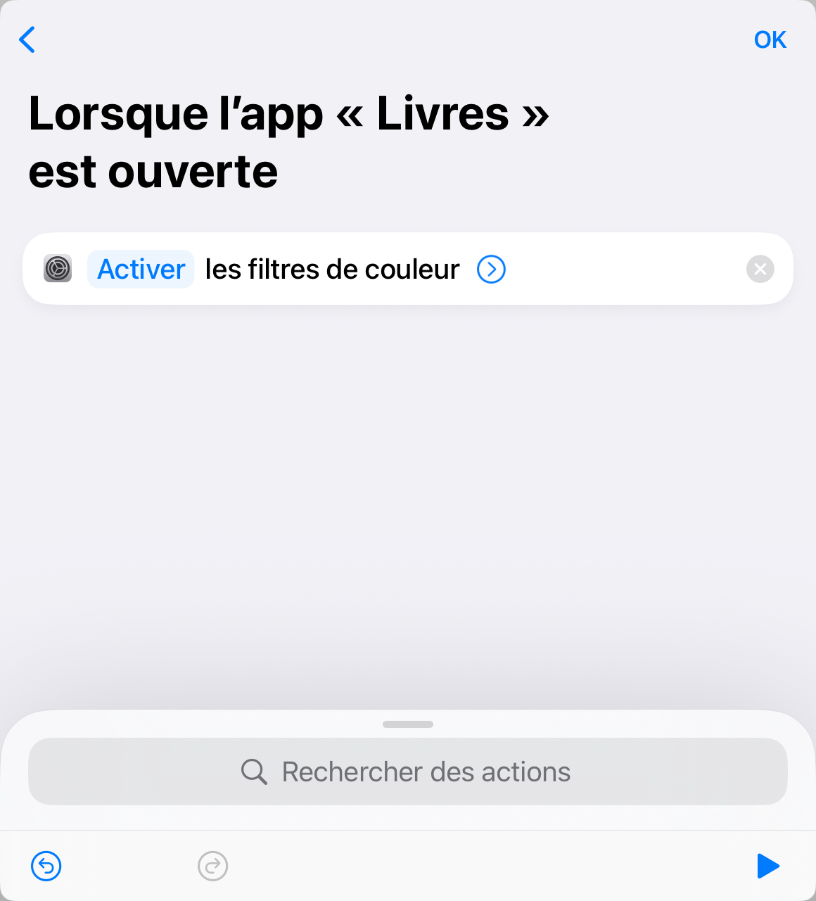Bonjour, je cherche la manière de mettre une automatisation que quand j’ouvre l’application Livre l’iPad se mette en nuance de gris et à la fermeture il revienne en couleurs. Merci