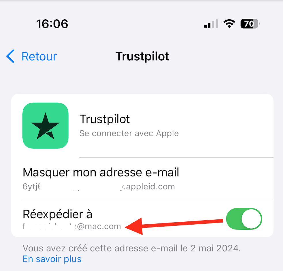 Pour information, la fonction de masquage d’e-mail fonctionne à merveille. Lorsque vous créez l’une de ces adresses, Apple n’autorisera la réception de mails que de la part d’une adresse du même nom de domaine que celui à laquelle elle est destinée (Vinted dans votre cas).