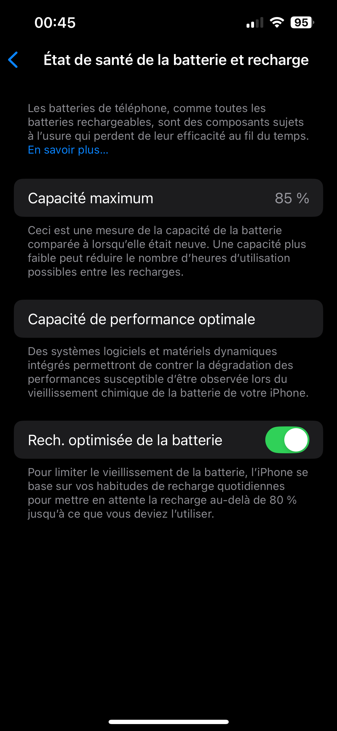 Une baisse aussi rapide de l’état de santé de ta batterie n’est pas normale. En général, une batterie d’iPhone perd quelques pour-cent par an, mais pas 5% en quelques semaines.