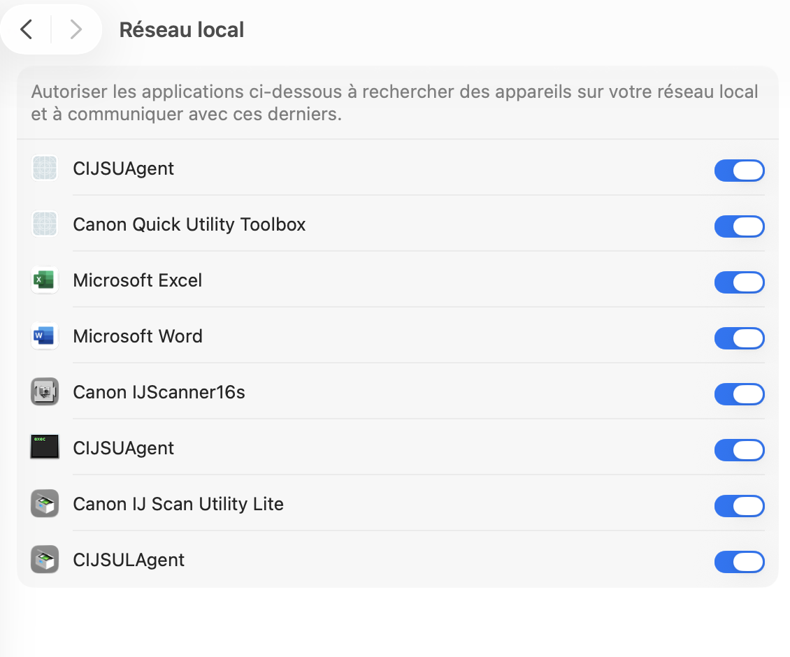 Depuis la mise à jour Tahoe, je peux imprimer depuis le mac mais pas scanner erreur 21345. J'ai annulé l'imprimante (Canon) , l'ai ré installée, toujours le même message Failed to open a connection error 21345.