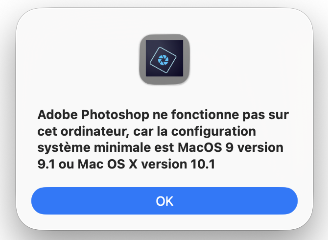 J'ai un AdobePhotoshop Element 2020 installé sur mon Mac Studio, j'ai le même message, et il ne fonctionne plus.