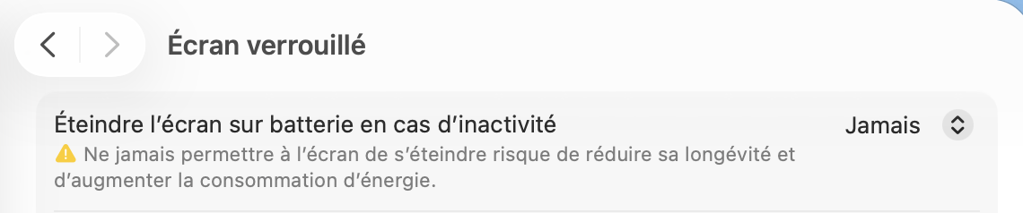 Merci pour ton retour, tu as visé juste en m'orientant sur Écran verrouillé alors que je m'obstinais à faire ce réglage sur Batterie.