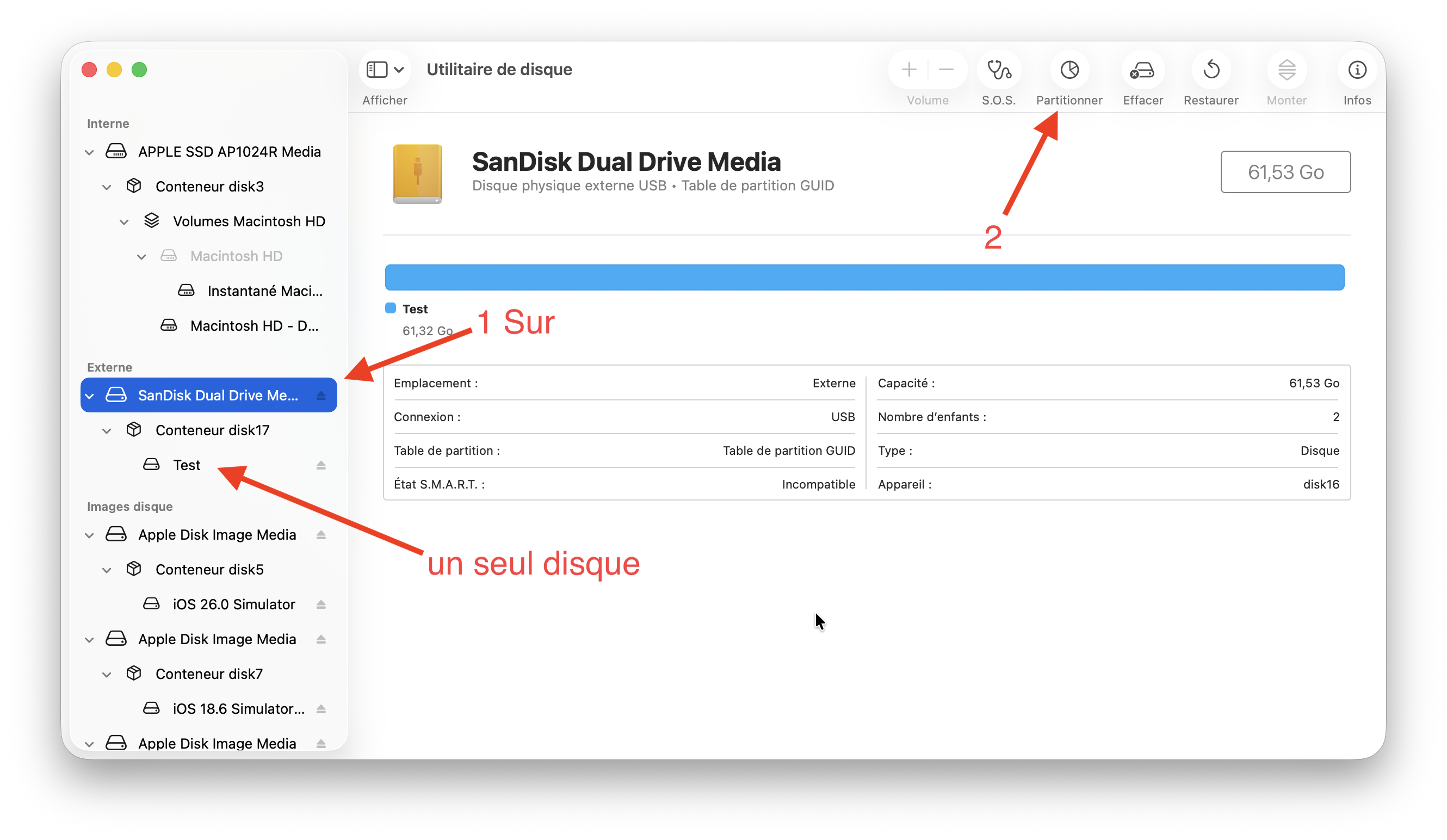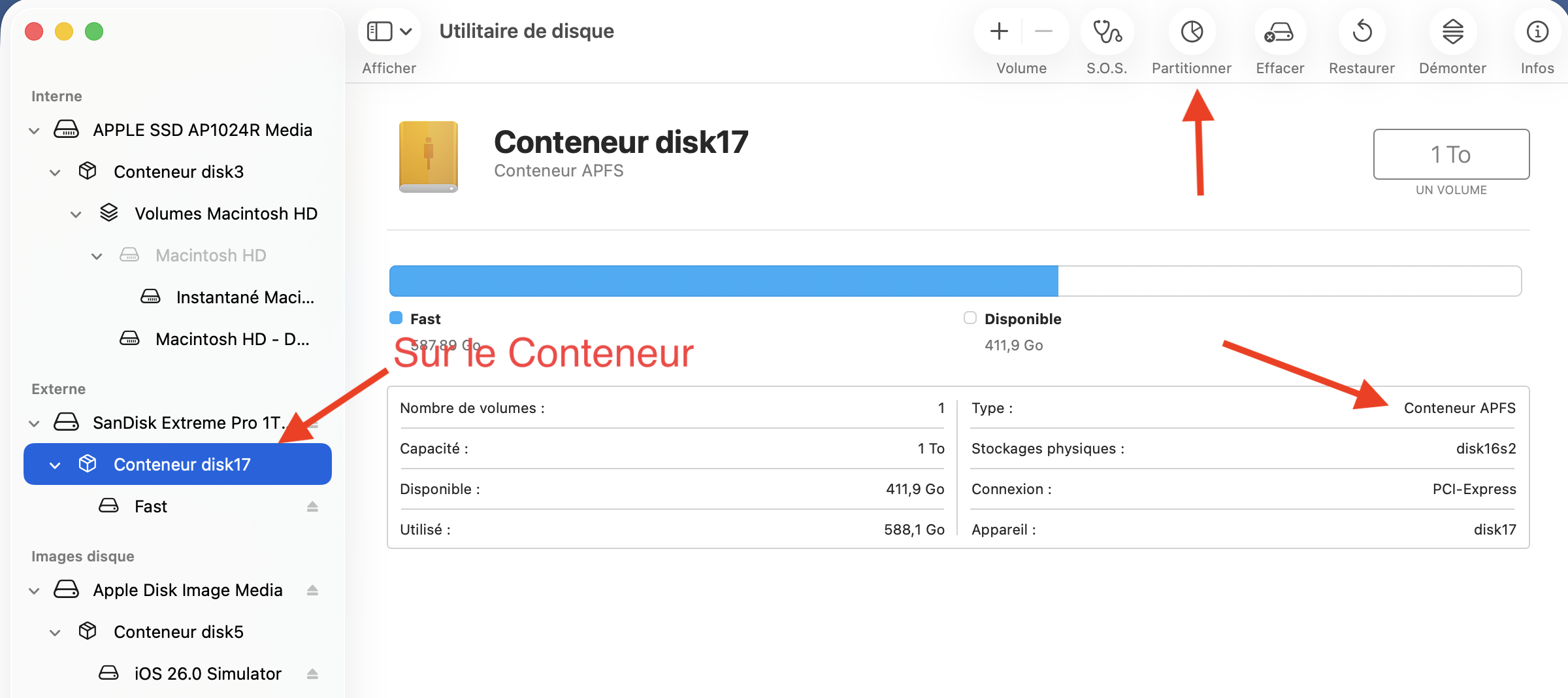 Je viens de réessayer : je constate qu'il y a une partie de 524 Go SSD TESLA mais je n'arrive pas à partitionner l'autre partie du SSD ? Peut-être une erreur de formatage à l'origine ? Je vois TABLE DE PARTITION APPLE ???