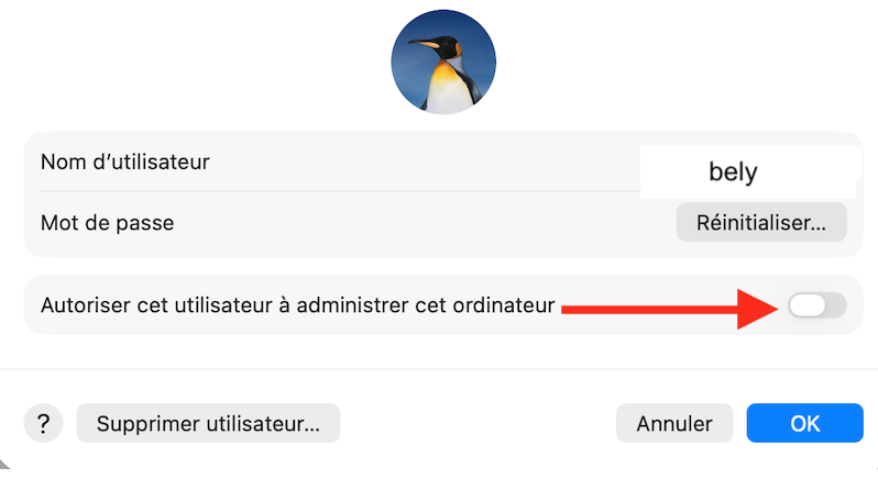Cependant, lorsque je clique sur le symbole ⌽ à côté de mon nom pour cocher « Autoriser cet utilisateur à administrer cet ordinateur », le Mac me demande le mot de passe de l’administrateur ou du compte “Utilisateurs et groupes”.