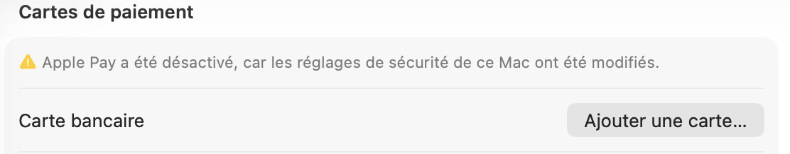Apple Pay a été désactivé, car les réglages de sécurité de ce Mac ont été modifiés.
