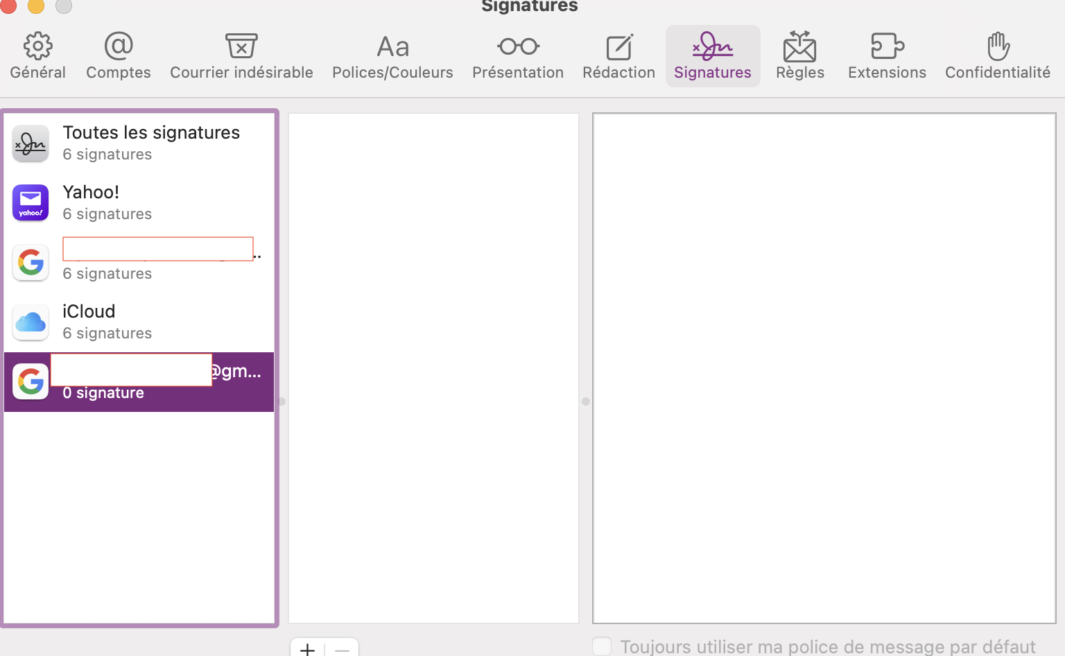 Mail sur macBook air. Signature : aucune. impossible de télécharger les signatures pourtant bien présentes dans Signatures.Le problème ne se posse que sur mon adresse gmail principale. Il n'y a pas ce problème sur l autre .Quid ???