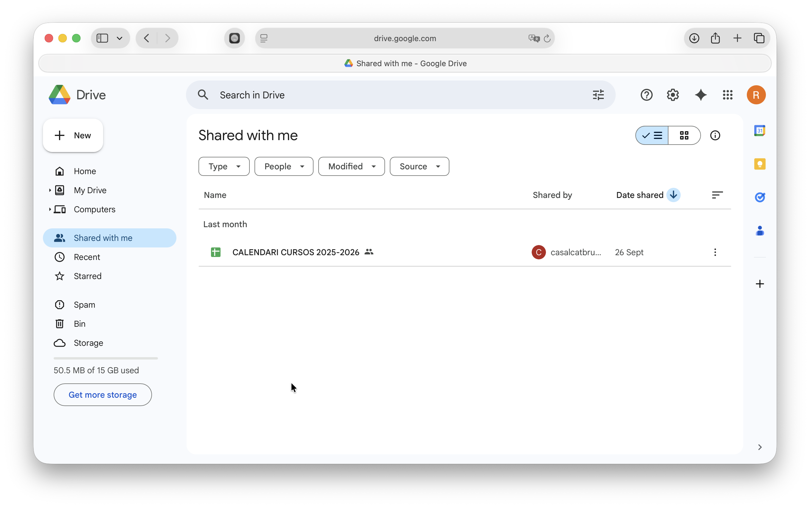 My teacher tells me that I should be able to see the documents she shares on my Google Drive under "Shared with me". But the only document I have under "Shared with me" is the lesson calendar sent by the language school from its own e-mail address. I don't even know how it got there.
