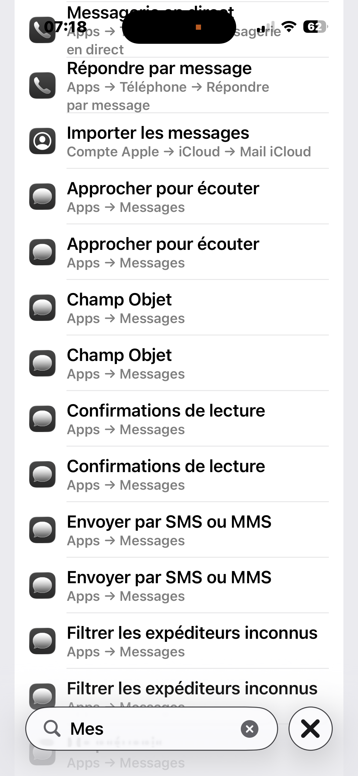 Il faudrait peut-être reconstruire l’index de recode Messages. Pour cela, accédez à Réglages > Apps > Messages > Recherche, désactivez les 2 réglages, redémarrez votre iPhone et réactivez ces réglages. Attendez quelques minutes pour que l’index de recherche se reconstruise.