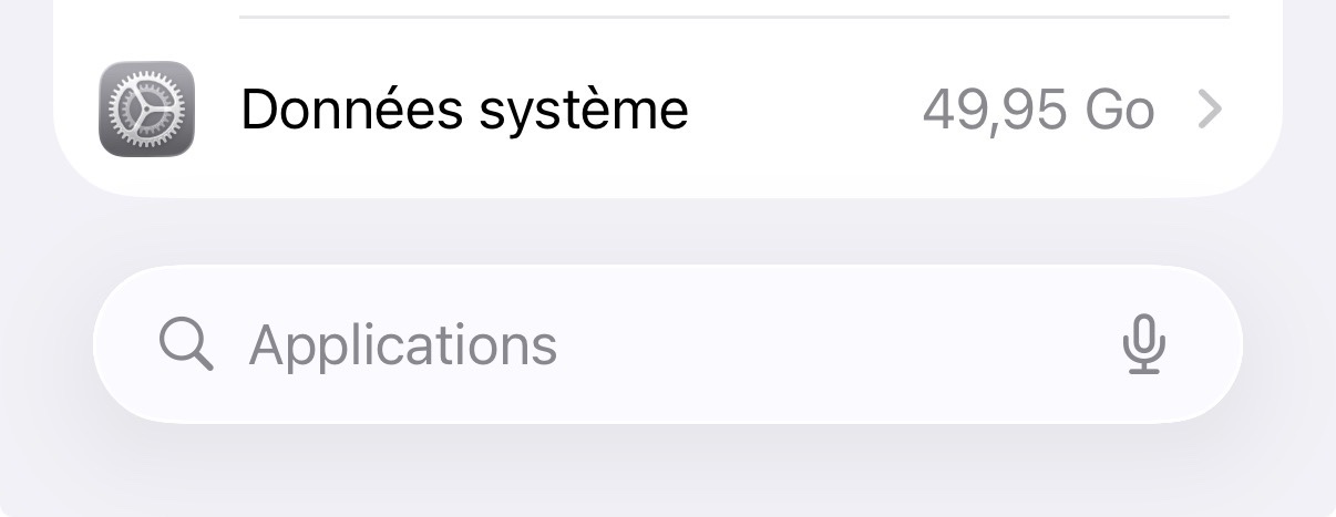 Depuis l’installation du dernier système iOS 26 sur mon iPhone 16 Pro, l’espace de stockage système indique 49,5 Go, alors qu’en réalité il ne devrait pas dépasser les 20 Go.
