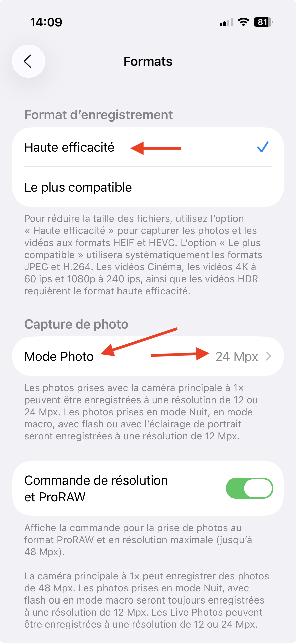 Et sélectionné pour le Formats d'enregistrement l'option «Haute efficacité»