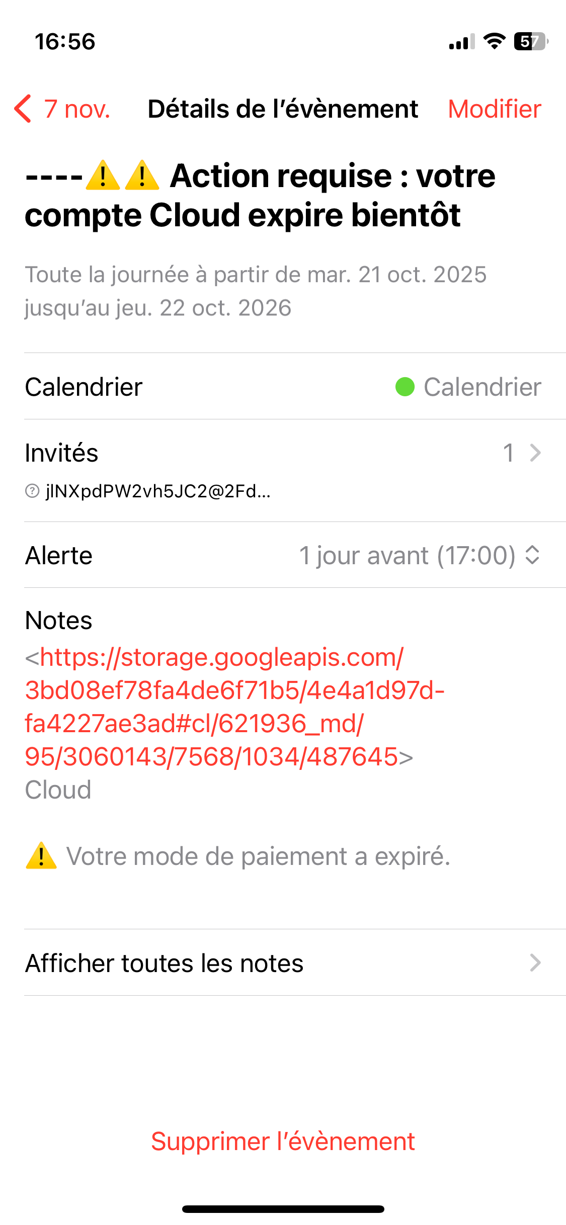 j'ai des messages concernant mon icloud qui expire par mail je sais que c'est une arnaque donc je n'ai cliqué sur rien, mais aujourd'hui j'ai carrément des notifications dans mon agenda perso tous les jours de toutes les années :