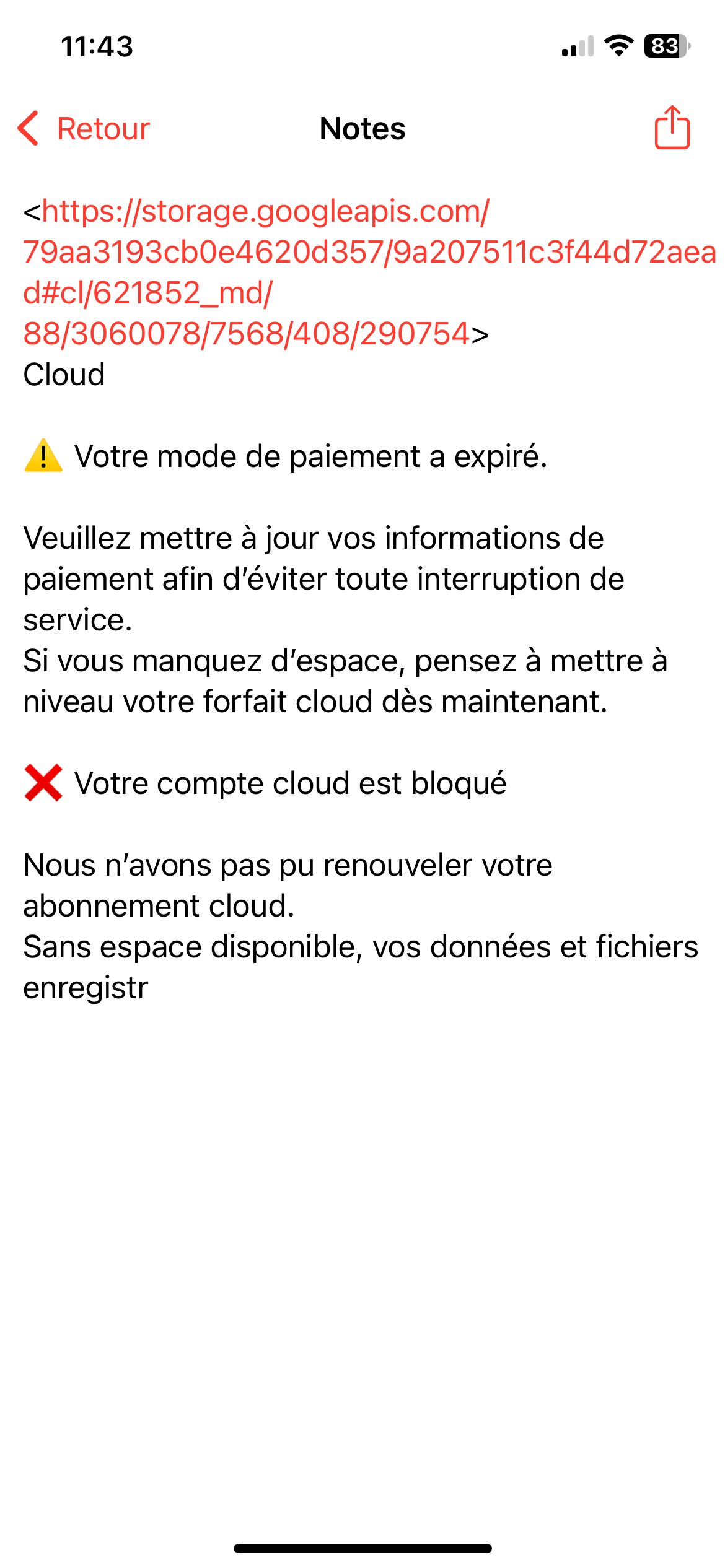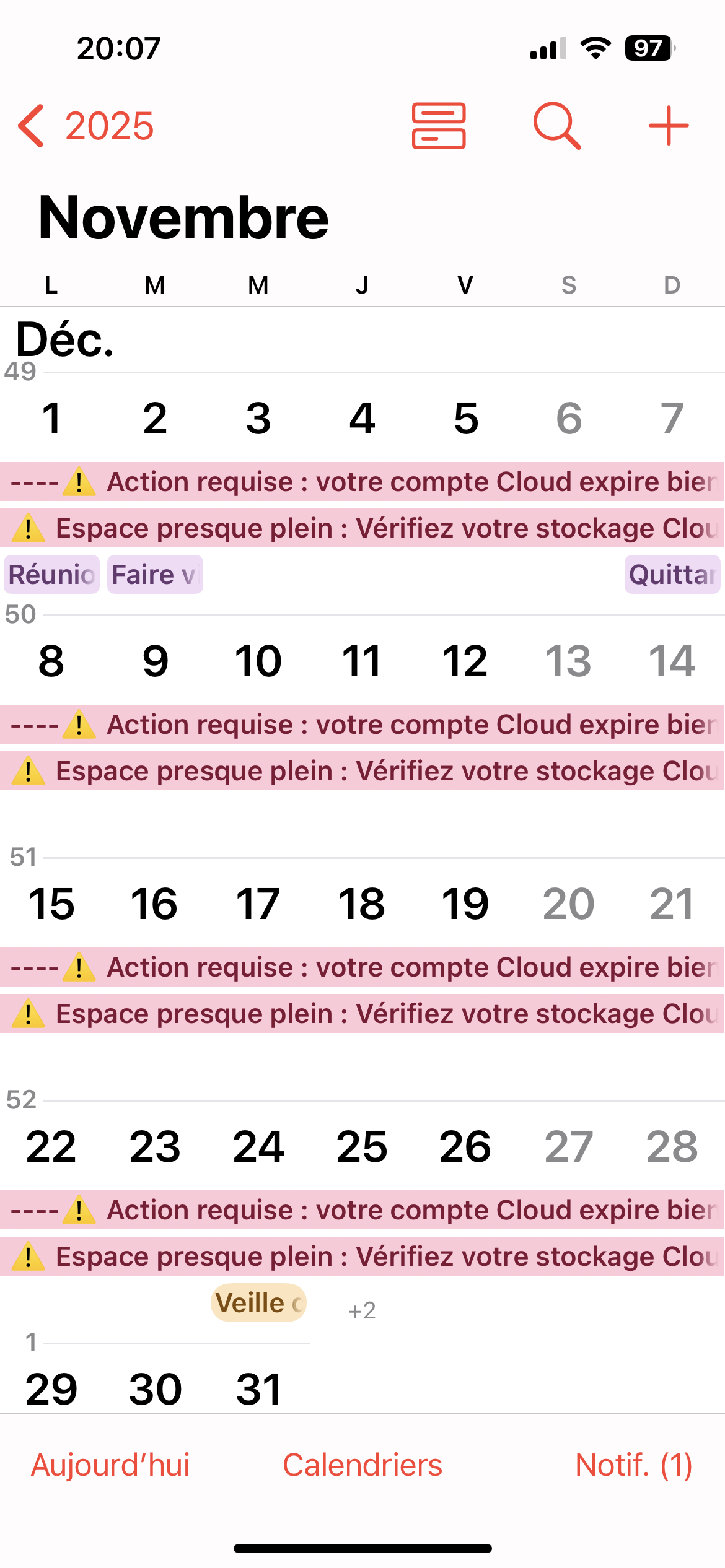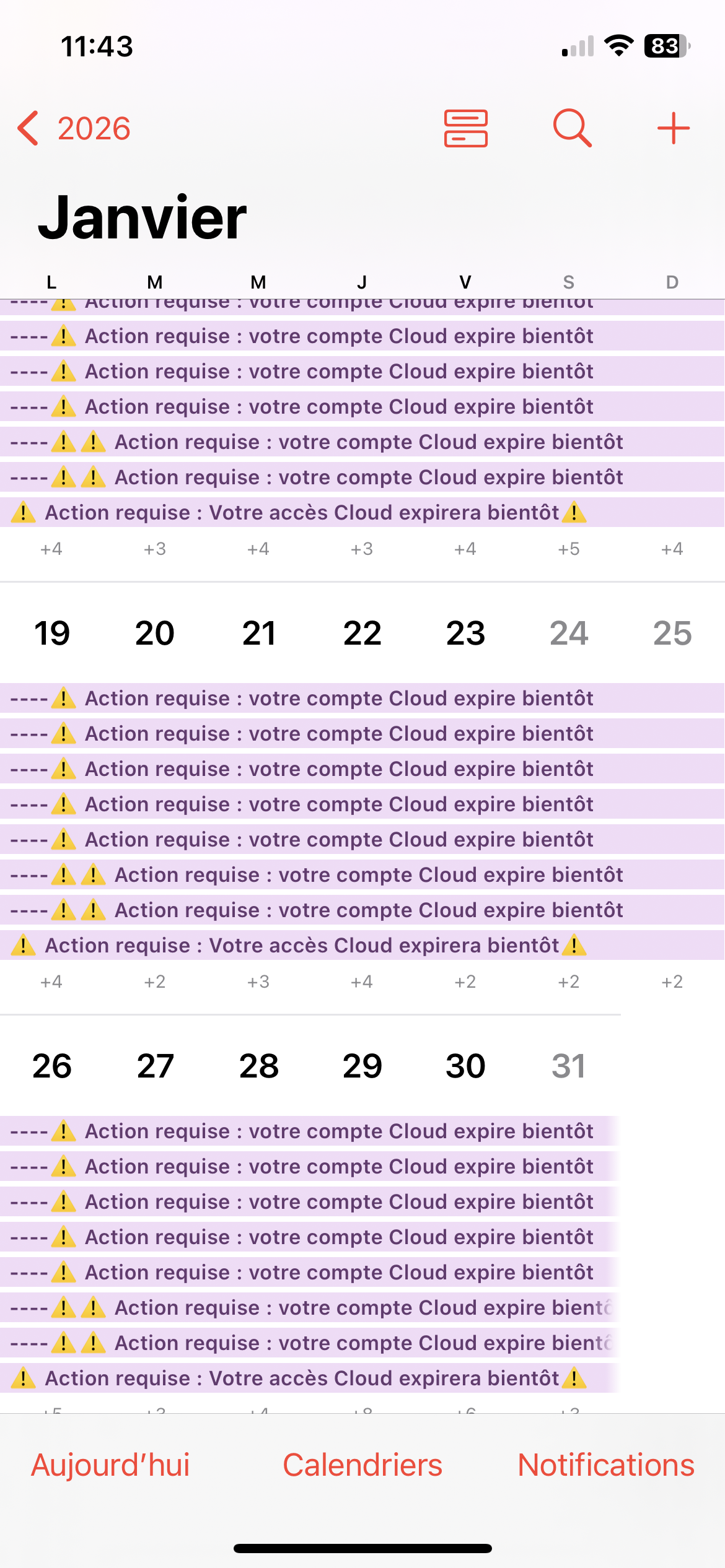 Sur mon calendrier Apple j’ai un message sur toutes les dates surlignees en rouge avec le message « action requise votre compte cloud expire bientôt,