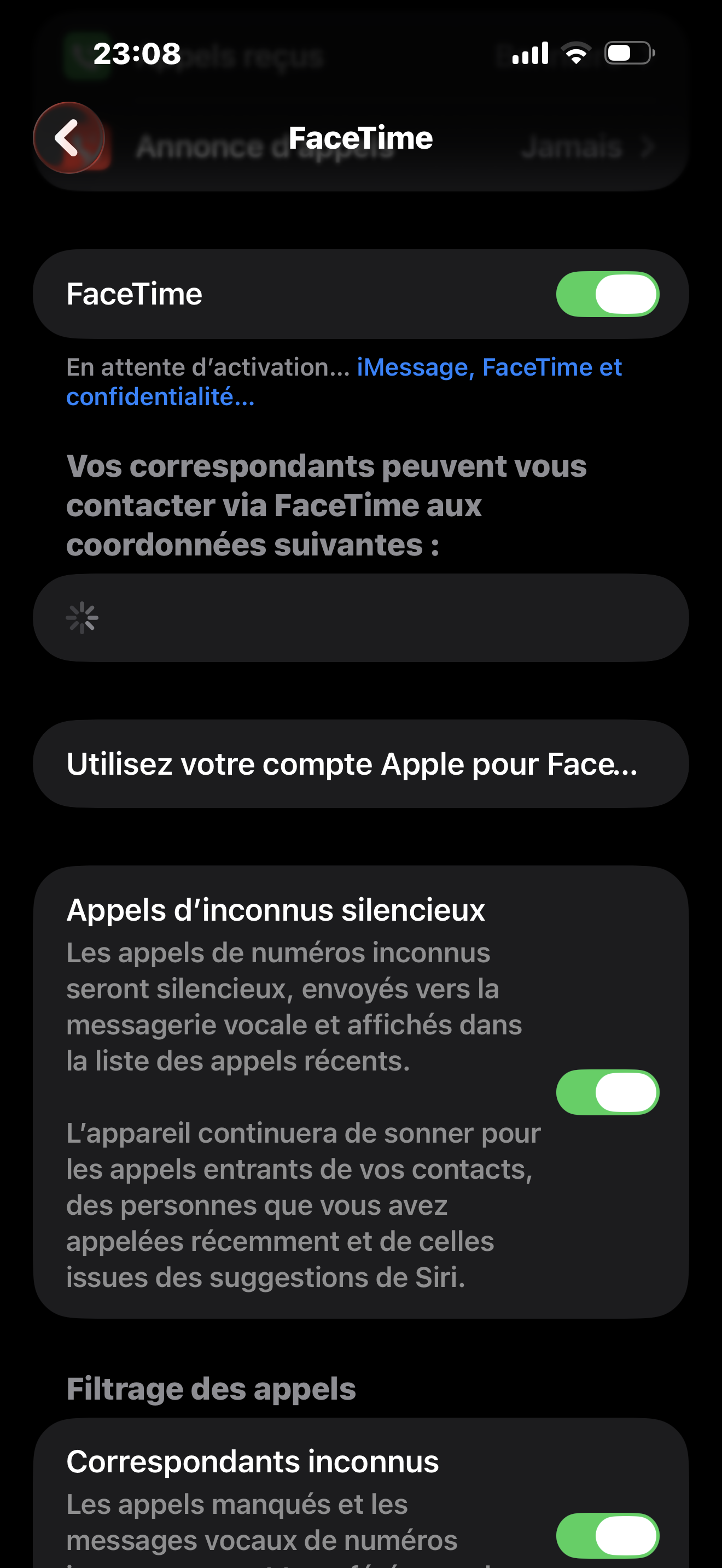Sur votre copie d'écran de Réglages > Apps > FaceTime, dans la section « Vos correspondants peuvent vous contacter », devraient apparaître votre numéro de téléphone et votre compte Apple, ce qui n'est pas le cas !