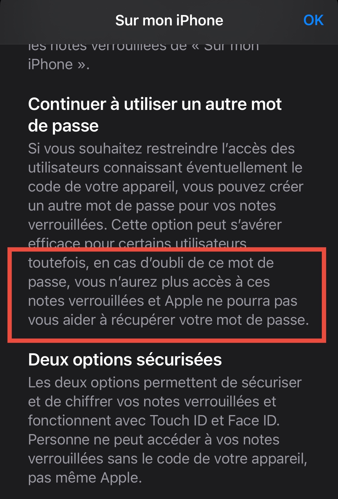 Il y a quelque année j’ai créé une notes que j’ai verrouiller avec un mot de passe