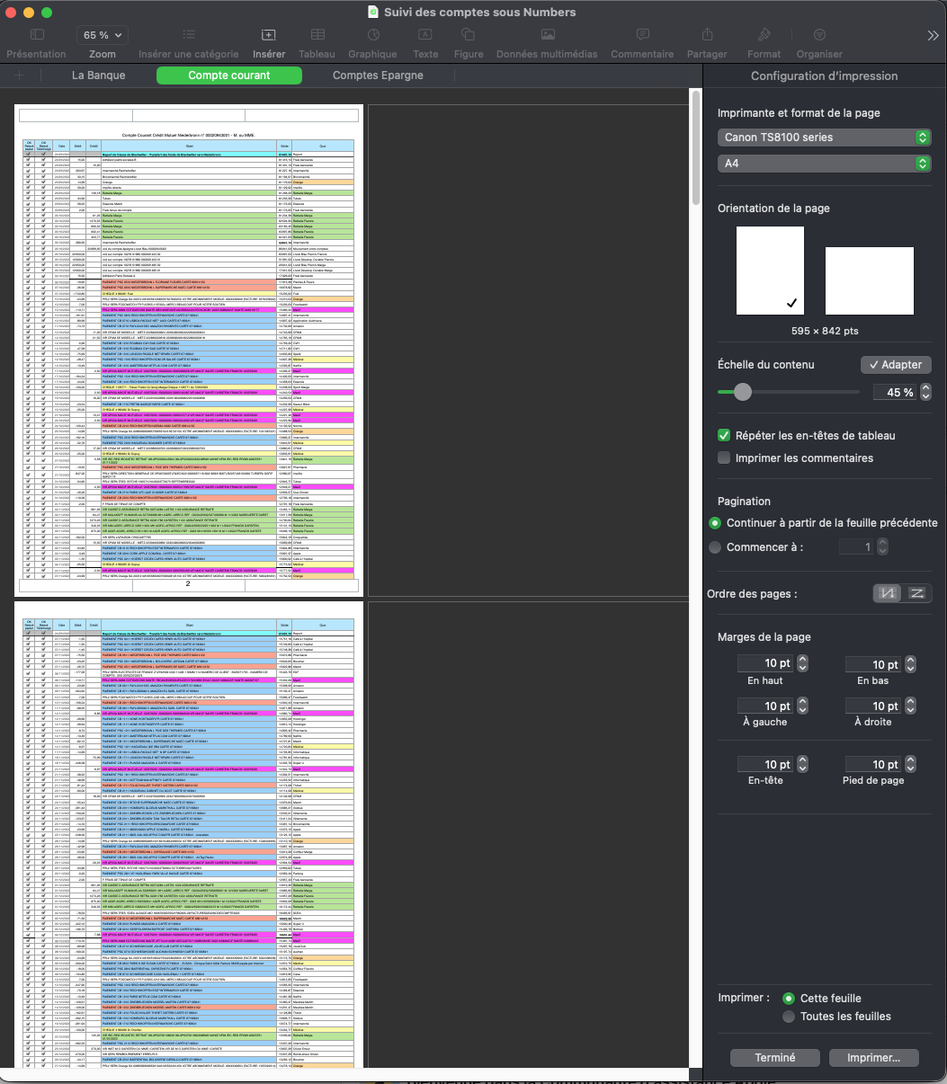 Si le document Numbers comporte plusieurs pages, l'idéal est de faire une capture d'écran de la partie que vous souhaitez imprimer puis d'aller dans Fichier>Imprimer.