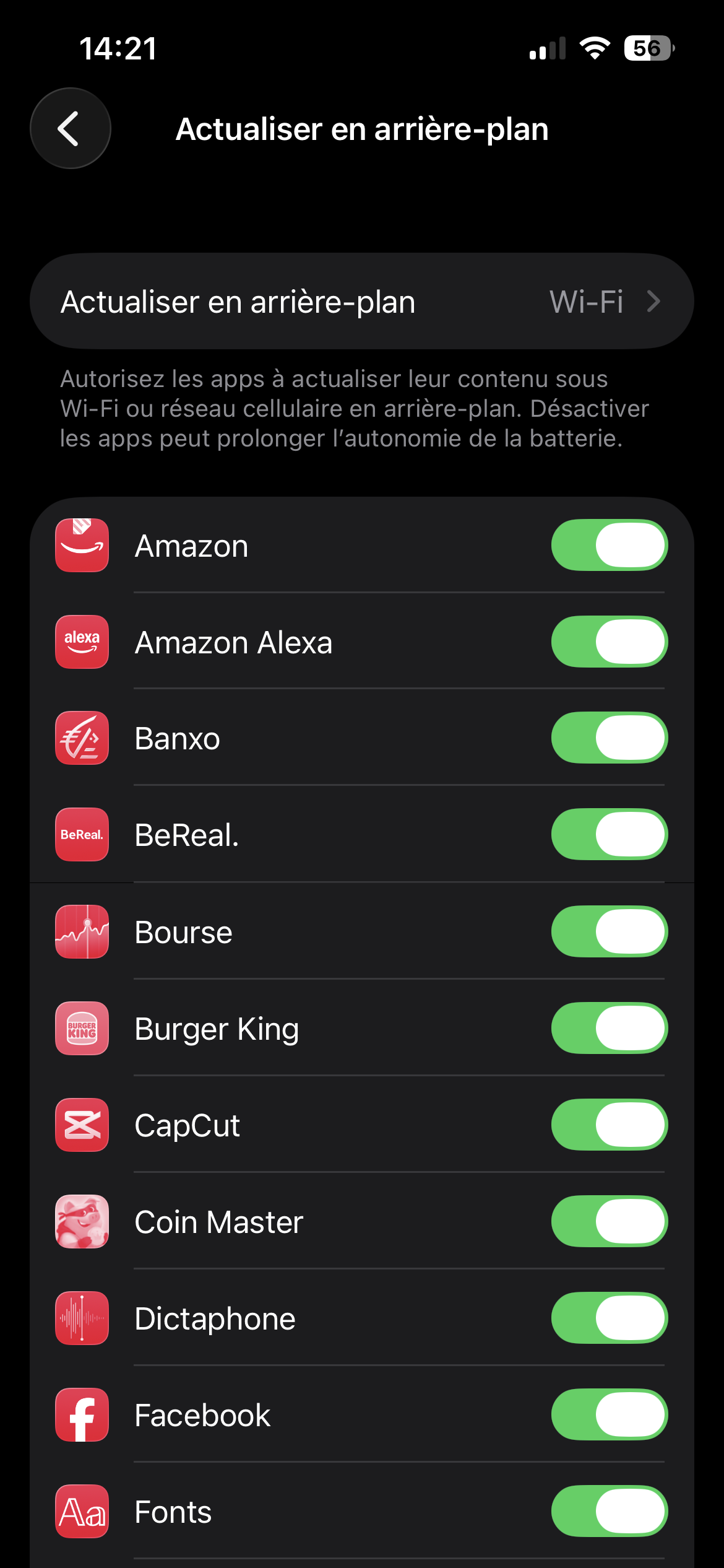 Par contre, désactivez l’actualisation des applications en arrière plan car leur contenu n’a pas besoin d’être actualisé quand vous faites autre chose et donc quand vous ne les consultez pas et préservera grandement l’autonomie de la batterie et ceci n’aura aucune incidence sur la réception des notifications ( ce sont deux réglages indépendants ) à condition que vous les laissiez activées