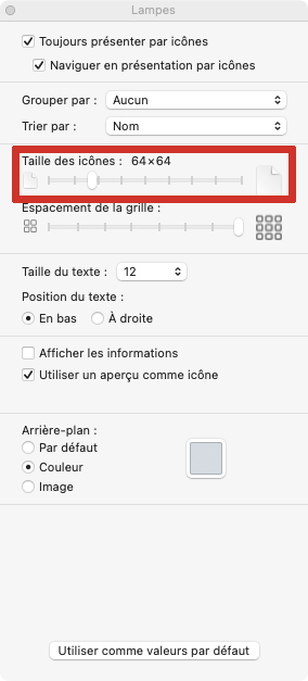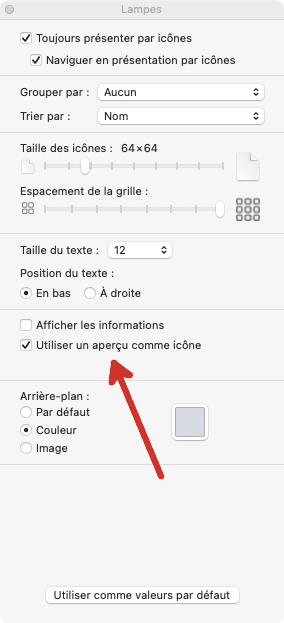 Il faut que la présentation soit "en icônes" (premier choix en haut de la fenêtre). Tu peux régler les dimensions des aperçus avec "Taille des icônes" et l'espacement entre les images avec "Espacement de la grille"