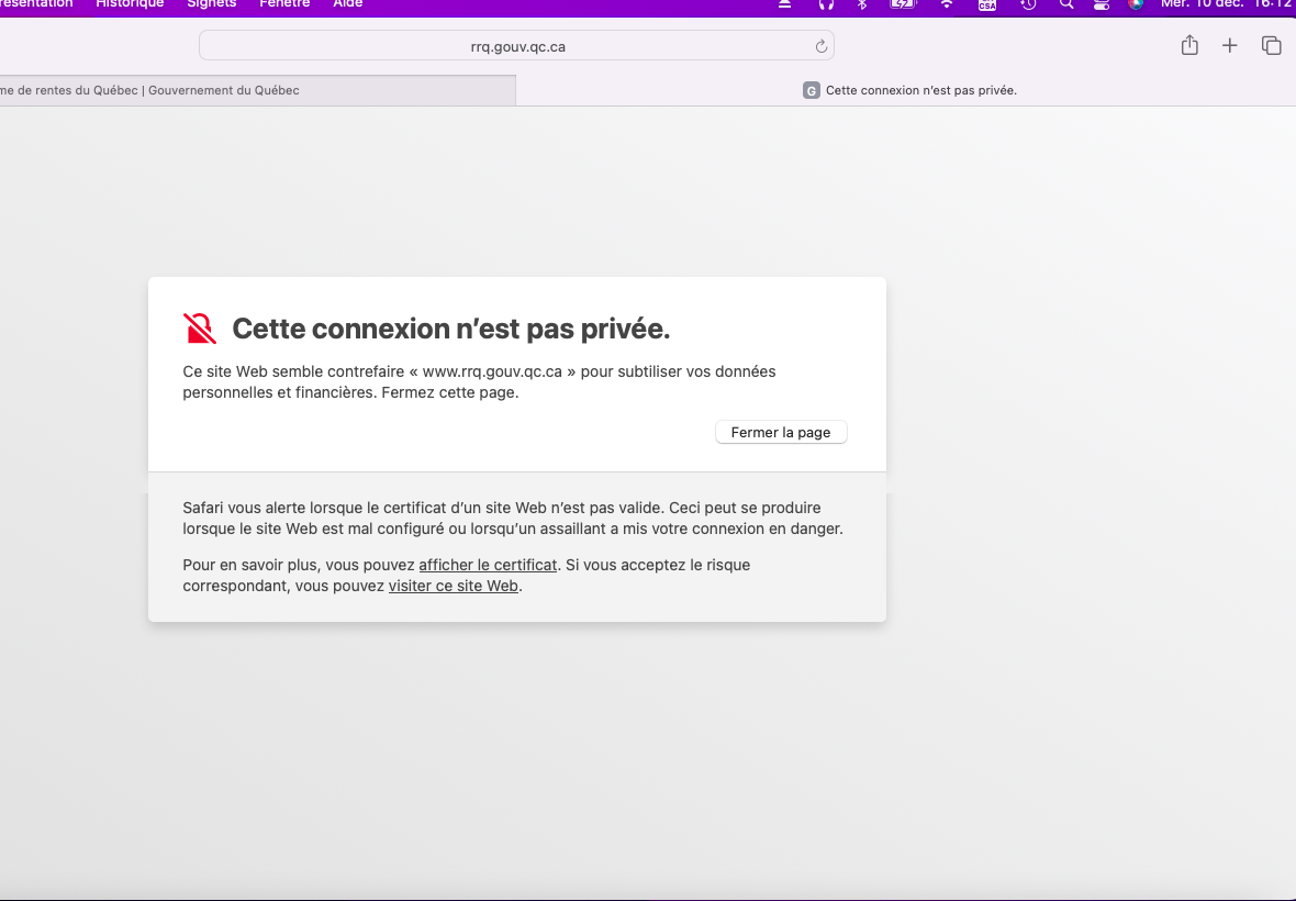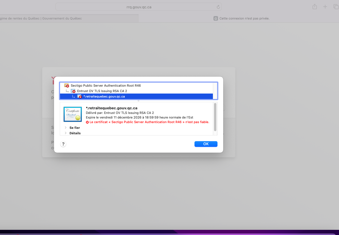 Lorsque je veux accéder à «Mon dossier» sur le site de retraitequebec.gouv.qc.ca, une fenêtre s'affiche et mentionne que le certificat n'est pas fiable. Comment est-ce possible puisqu'il s'agit d'un site gouvernemental?
