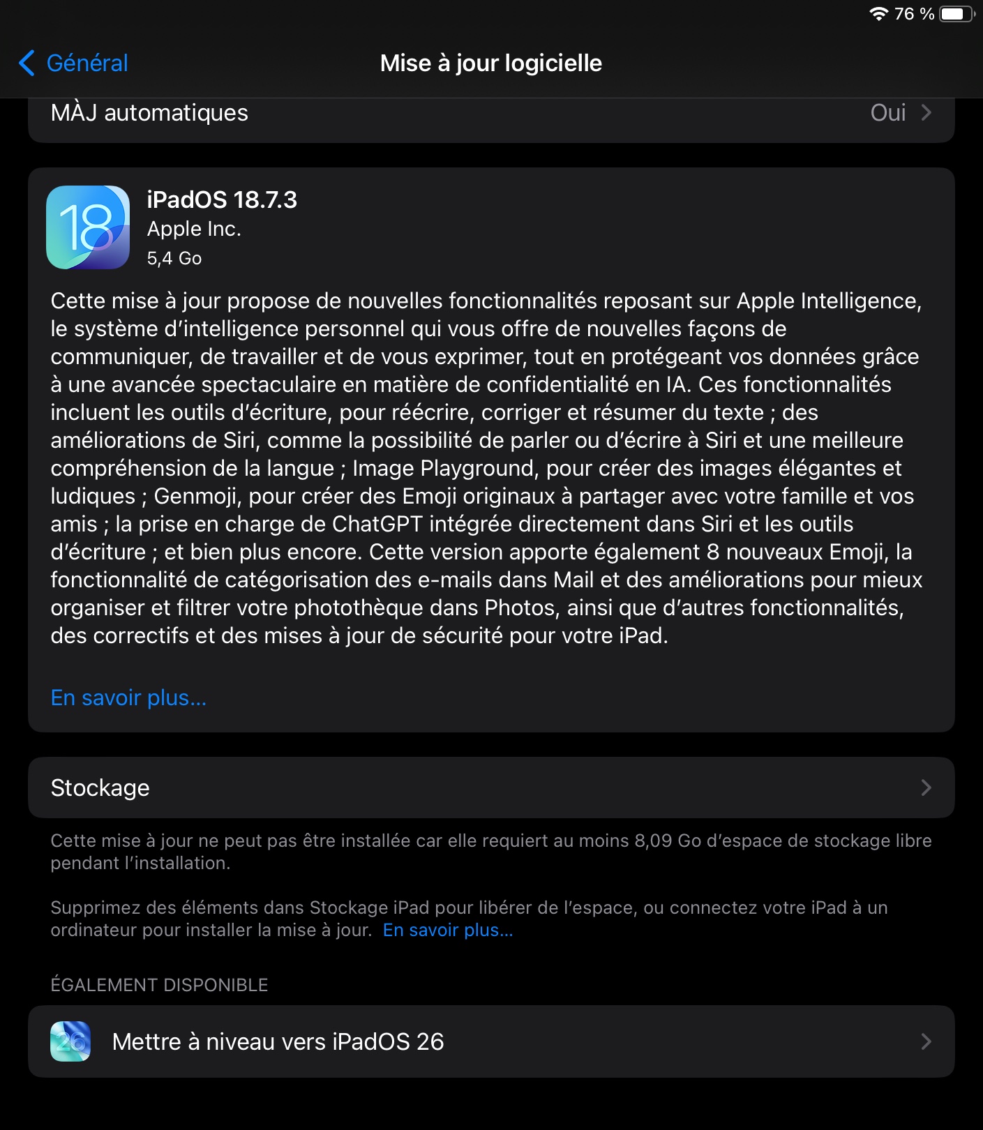 Bonjour, je dois faire la mise à jour iOS de mon iPad vers 18.7 ou vers iPad os 26. Il m’explique qu’il faut au minimum 8,08 Go d’espace libre pour le faire. Après avoir pratiquement supprimé toutes mes application pour le faire et avoir presque 10Go d’espace de libre, il me demande toujours de faire de la place. Je ne sais plus quoi faire 🥲