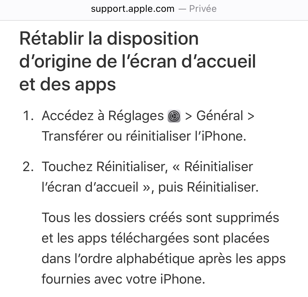 Tous les dossiers créés sont supprimés et les apps téléchargées sont placées dans l’ordre alphabétique après les apps fournies avec votre iPhone.