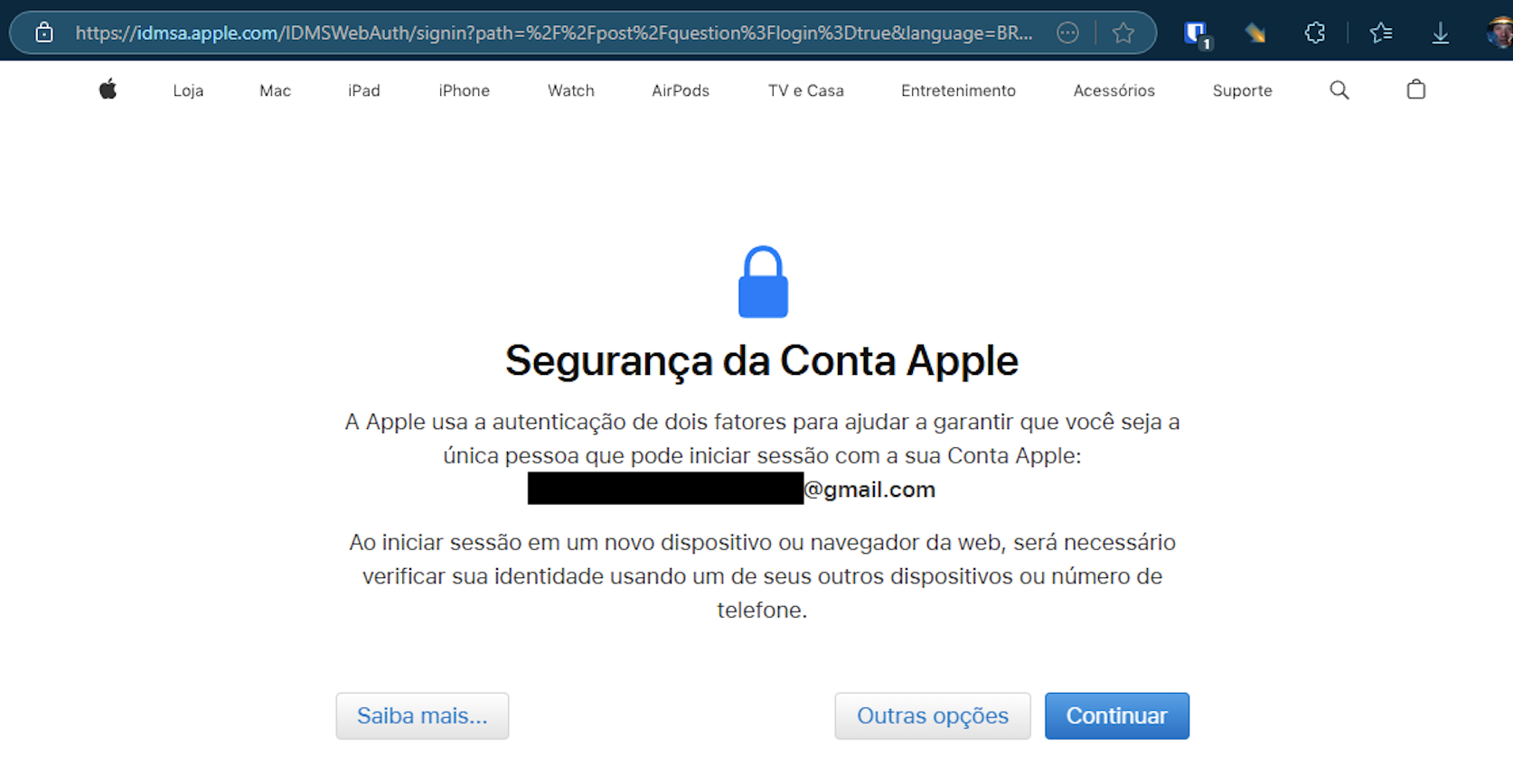 No botão continuar nada acontece (talvez porque não tenho mais acesso ao número de celular antigo e nem dispositivos apple com minha conta ativa), aí em Saiba mais é só artigo que não me ajudou, em "Outras opções" abre a tela: