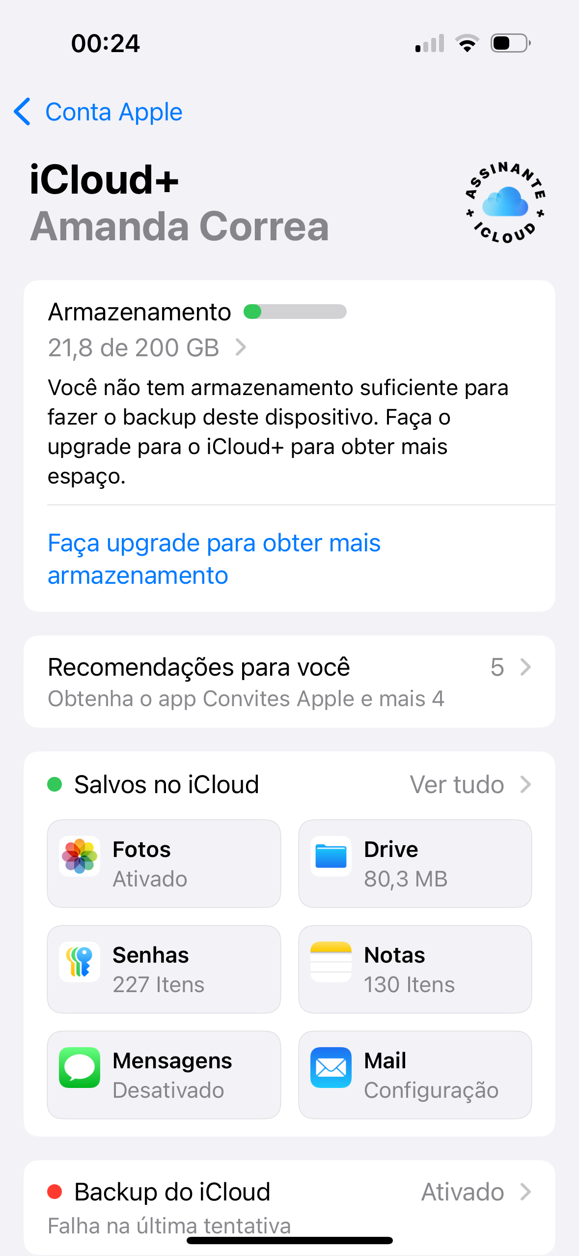 Comprei mais armazenamento no iCloud, mas mesmo só usando 21GB dos 200GB, aparece como iCloud lotado. Sei que é diferente do armazenamento do iPhone. Não consigo fazer o downgrade nem compartilhar com a família o espaço pq fala que tá lotado