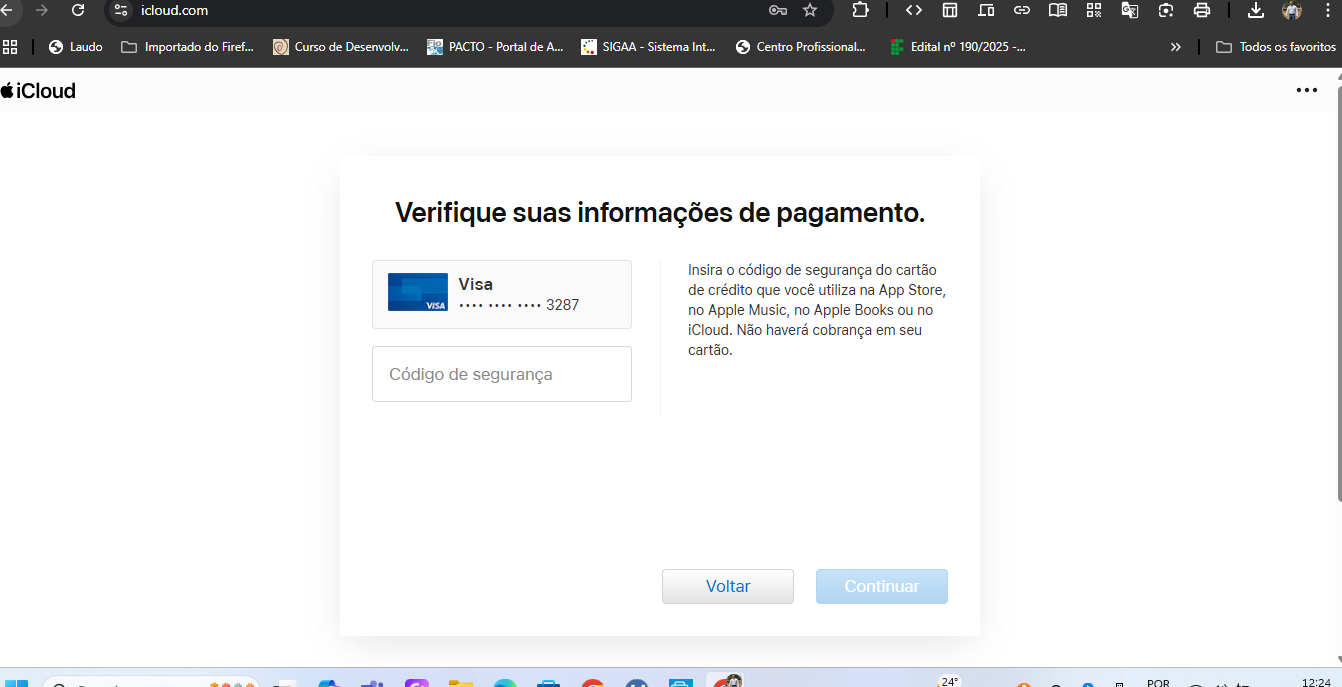 Infelizmente, devido ao bloqueio dos cartões e à perda do aparelho, perdi o acesso à minha conta iCloud, que estava vinculada ao cartão de crédito e dispositivo roubado.