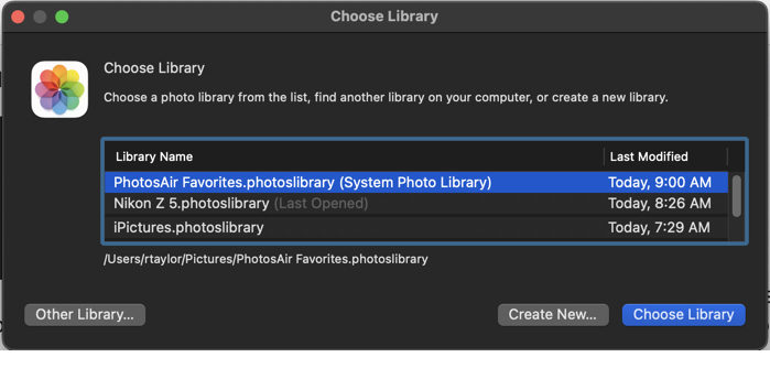 To do that, you create a new Library with the Library Chooser-- close Photos and option-click the Photos icon to get this: