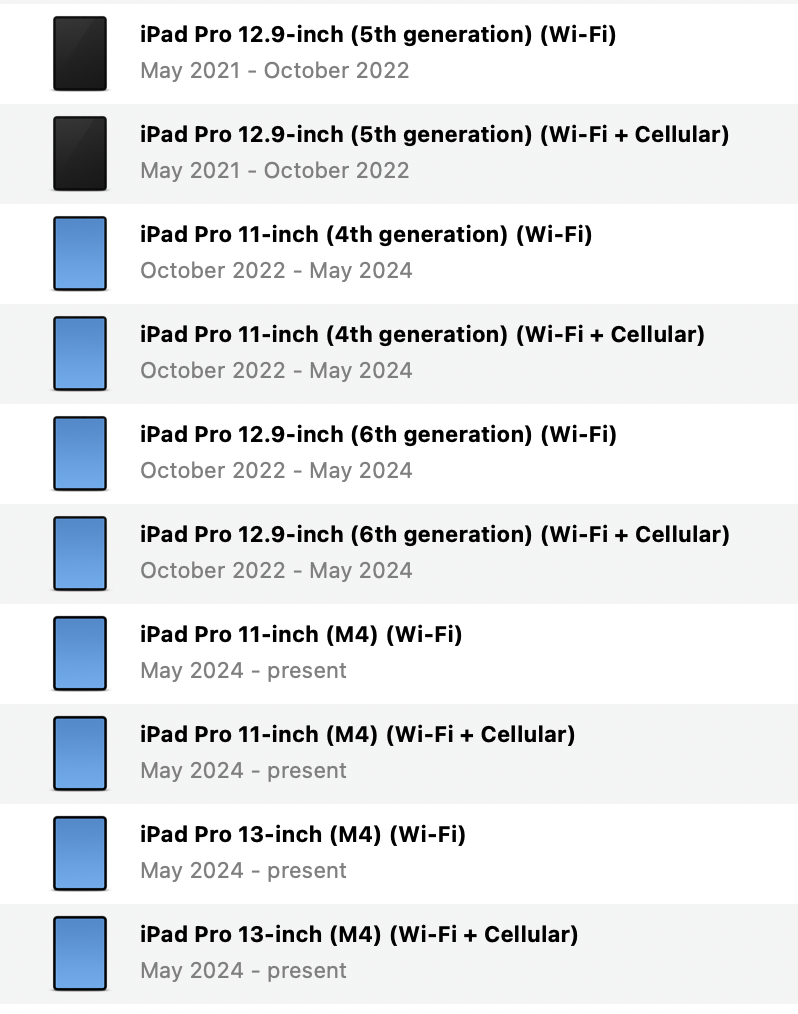 Note that 11-inch and 12.9-inch iPad Pros each had their own generation numbering. So, for instance, in March of 2020, Apple released the 4th-generation 12.9" iPad Pro at the same time as the 2nd-generation 11" one. If you are attempting to keep track of release dates, it may help to consult the MacTracker listing.