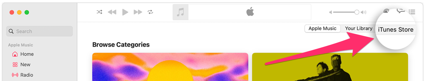Then click in the search box at the top of the left sidebar and then click the iTunes Store option at the top right of the main window as shown in the example below from Buy music from the iTunes Store on your Mac - Apple Support