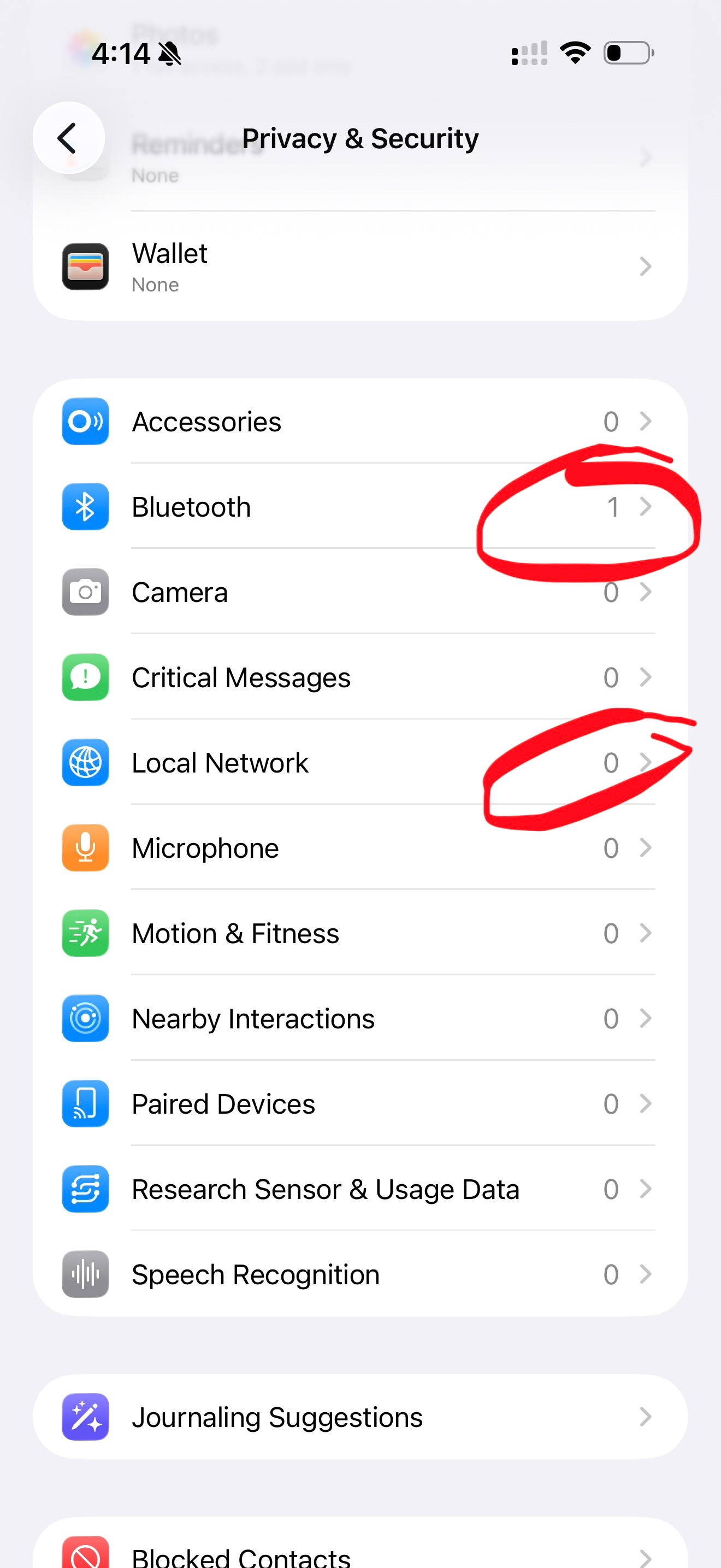 I’ve done a factory reset and even the firmware reset at the Apple Store. But yeah, basically if I allow an app local network access, it’s supposed to enumerate the number of apps that have access, and then when I click on local network, it’s supposed to specify which of those apps have access and I can toggle the access on or off (i.e., for the Bluetooth it’s the same, so you can see it says 1, and I have the ability to see which 1 of those apps have access and are able to toggle on and off).