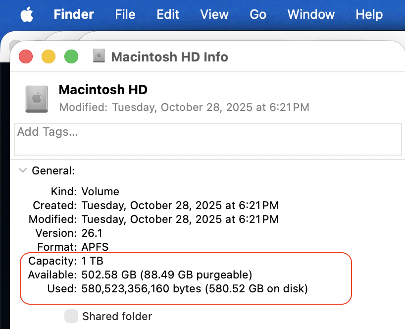 The macOS can take days before it releases/restores... there is used, purgeable, free space